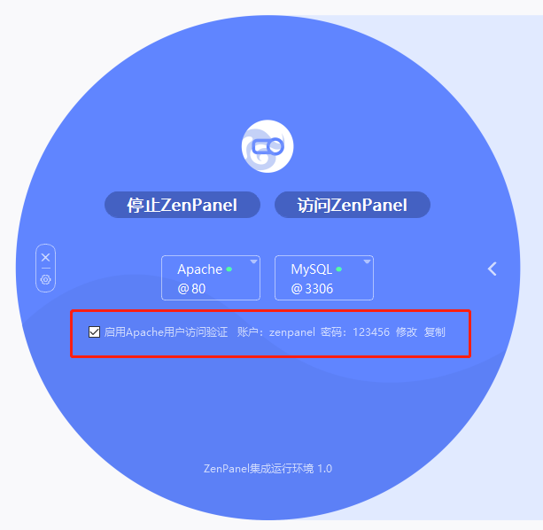 Apache用户访问验证,点击修改可以修改账户和密码,修改后的密码要符合设置的密码要求,点击后面的复制按钮可以复制账户密码信息。
